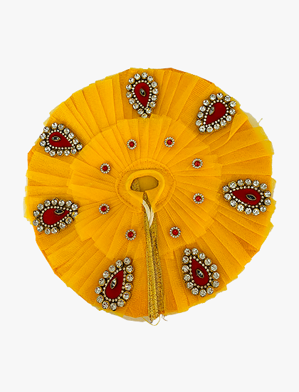- TRADITIONAL DESIGN: Beautiful yellow dress with red crystal embellishments featuring an elegant circular wheel pattern and decorative accents for Laddu Gopal idols