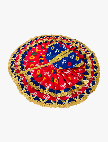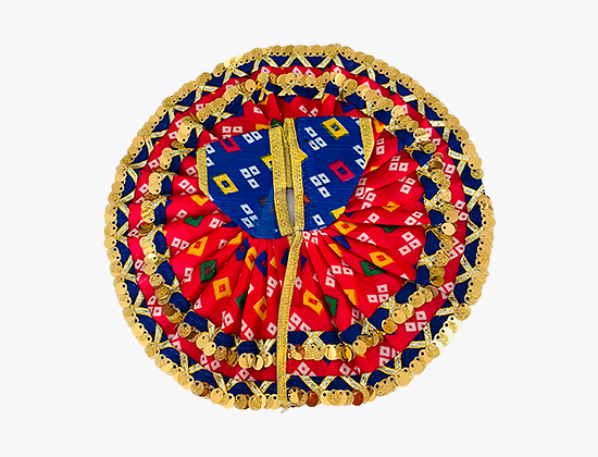- TRADITIONAL DESIGN: Beautiful Laddu Gopal dress featuring vibrant red and blue printed pattern with intricate geometric motifs and golden trim detailing